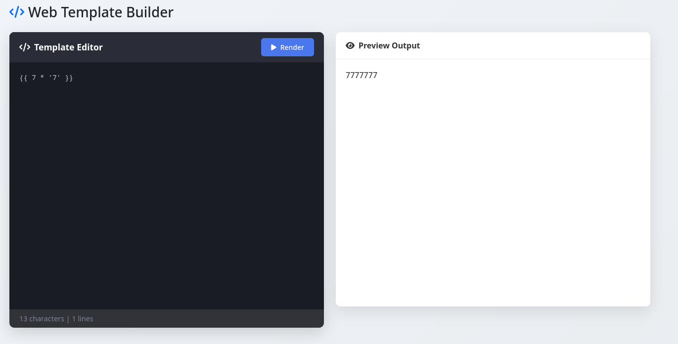 This confirms SSTI is possible and the template is Jinja2 because the output of {{7*'7'}} is 7777777. If the output is 49 the template is Twig.